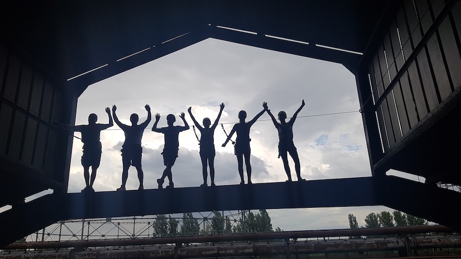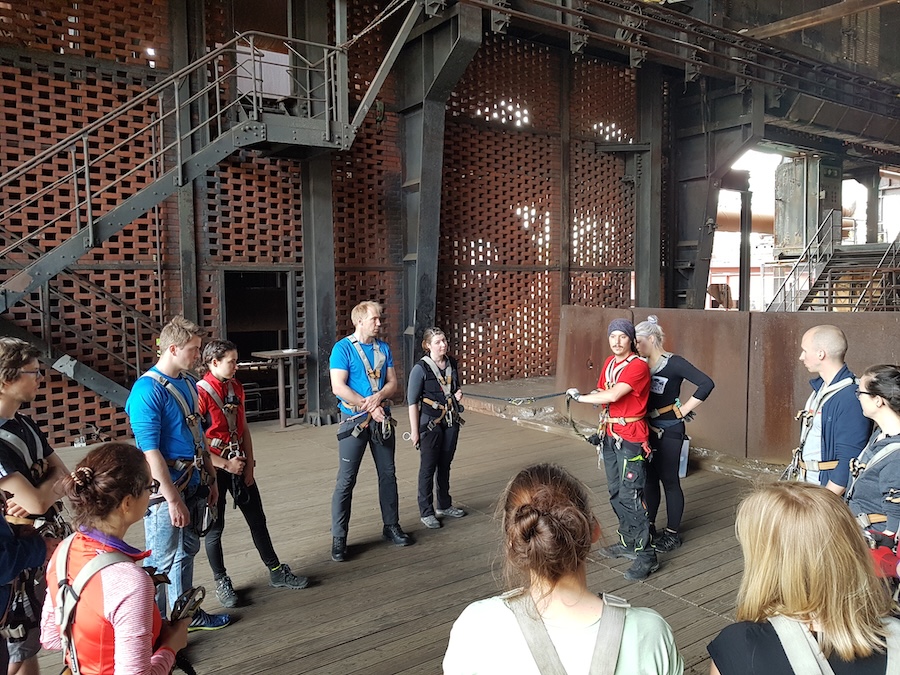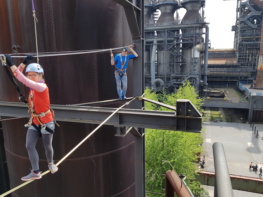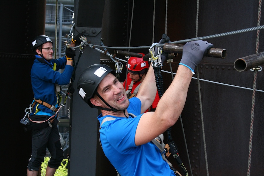 Mit niedrigen Elementen angefangen, gewöhnen wir uns Stück für Stück an die Höhe und schrauben uns in der ehemaligen Gießhalle bis unter die Hallendecke. Dann geht es nach draußen und damit immer weiter hinauf zum Highlight, der Steelroad in 50 Metern Höhe. Hier erleben wir den Ausblick über das halbe Ruhrgebiet, bevor wir in rasanter Abseilfahrt wieder den Boden erreichen.
