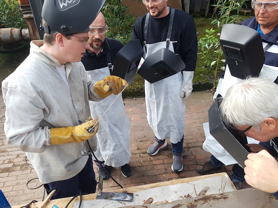 Lichtbögen, Funkenflug, Trennschleifer, Schraubstock – Metallverarbeitung live und mit allen nur denkbaren Tricks und Kniffen. Hier wird gearbeitet, hier geht es richtig „zur Sache“. Um ein stählernes Souvenir aus den vielen kleinen Zutaten zusammenzubauen, gehört neben einer genauen Planung und Absprache im gesamten Team natürlich sehr exaktes Arbeiten, damit sich die Einzelteile auch zusammensetzen lassen. So gilt es die Werkzeuge richtig zu handhaben, die Schweißnähte sauber zu ziehen und die Verbindungen genau einzupassen, um am Ende ein ansehnliches Ergebnis zu erzielen.